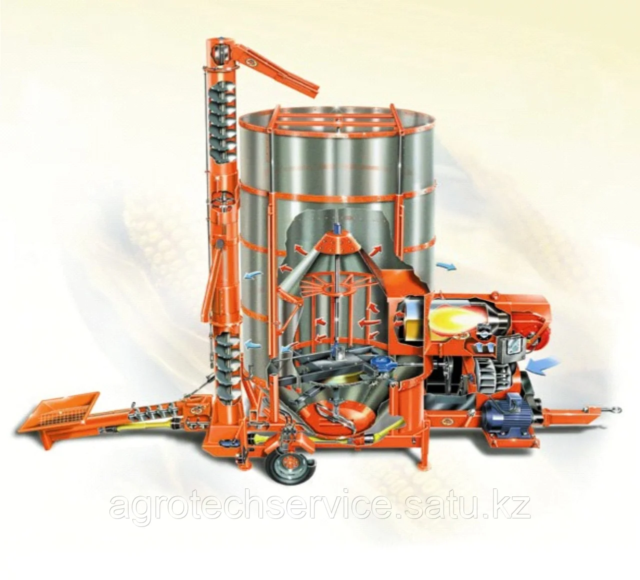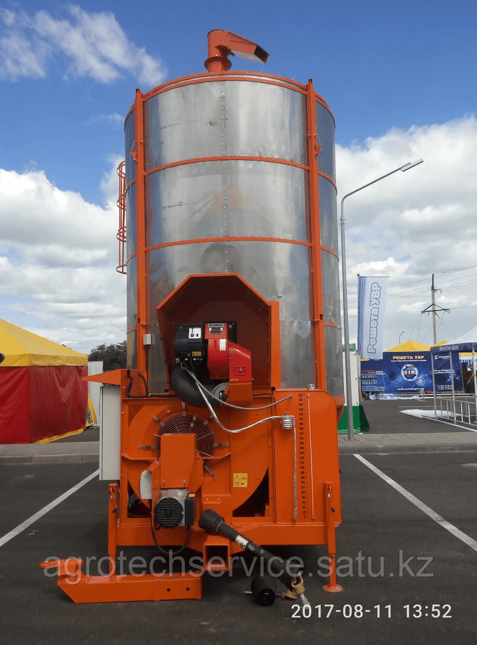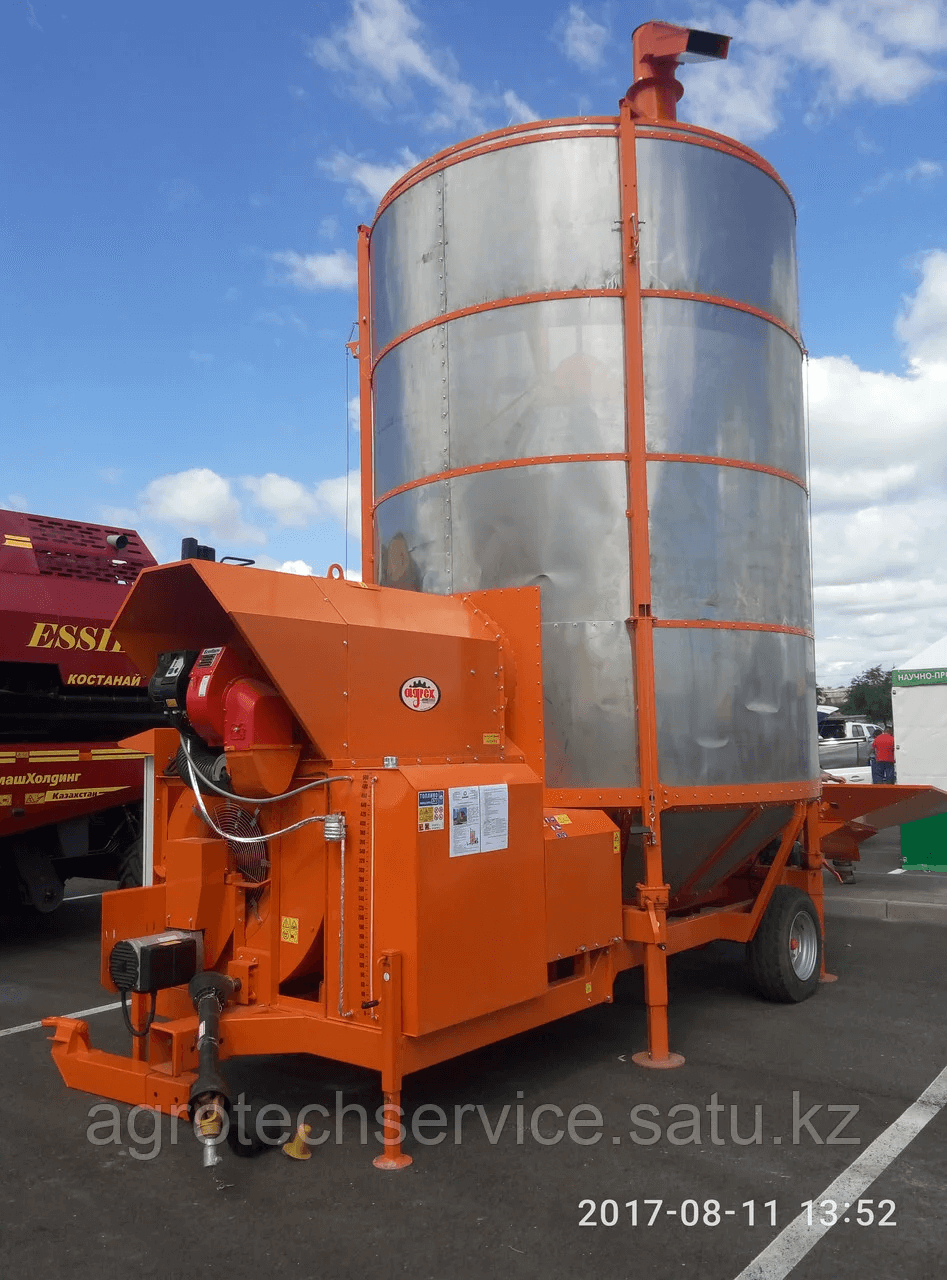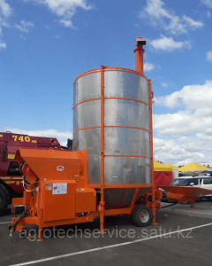 В стандартную комплектацию мобильных зерносушилок входят: электропривод 380 Вольт, система аспирации, дизельная горелка, диаметр отверстия сетки 2,5 мм, купол защиты от дождя, гидравлическая система подъема и опускания шнека, производительность вентилятора 50 тыс.м.куб. Гарантия производителя - 1 год.